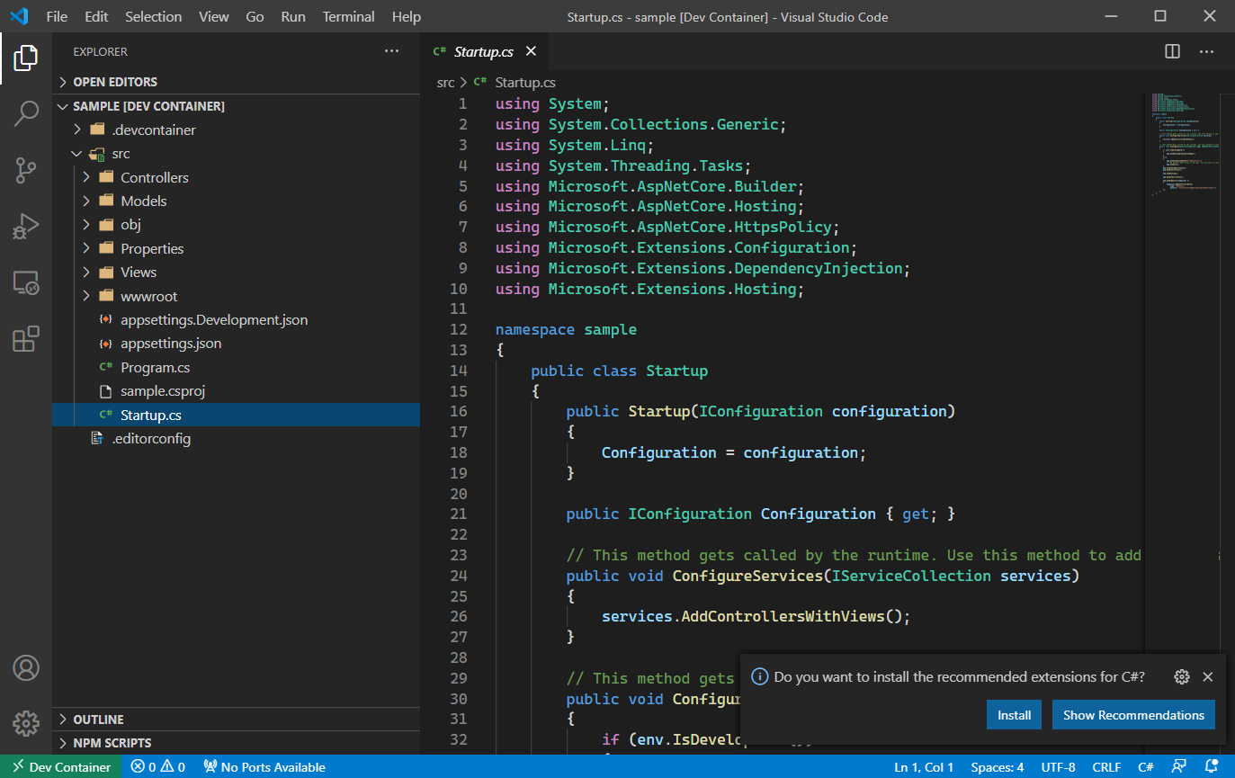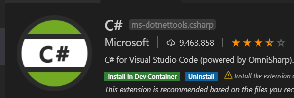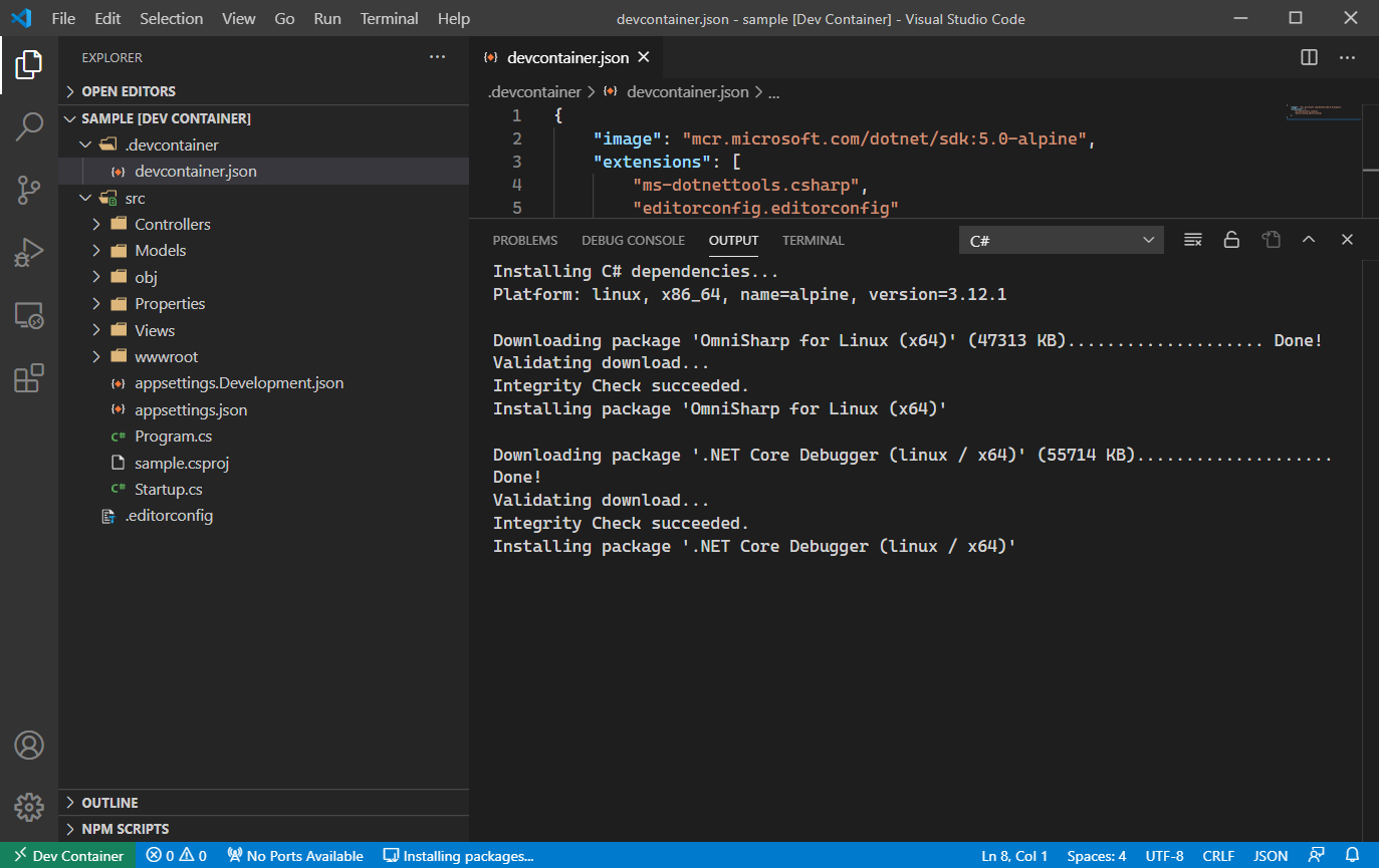 Notice how the C# Extension is installing its dependencies. That’s because the main extension was already preinstalled during bring-up and we’re greeted by its first-launch dependency installation. Also notice that we’re installing the Linux dependencies even if this screenshot was taken on Windows.